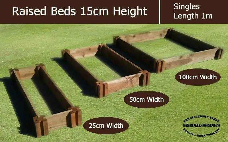Our 15cm high (1 plank) Single Raised Beds can be bought in three different width sizes; 25cm, 50cm and 1m (100cm)