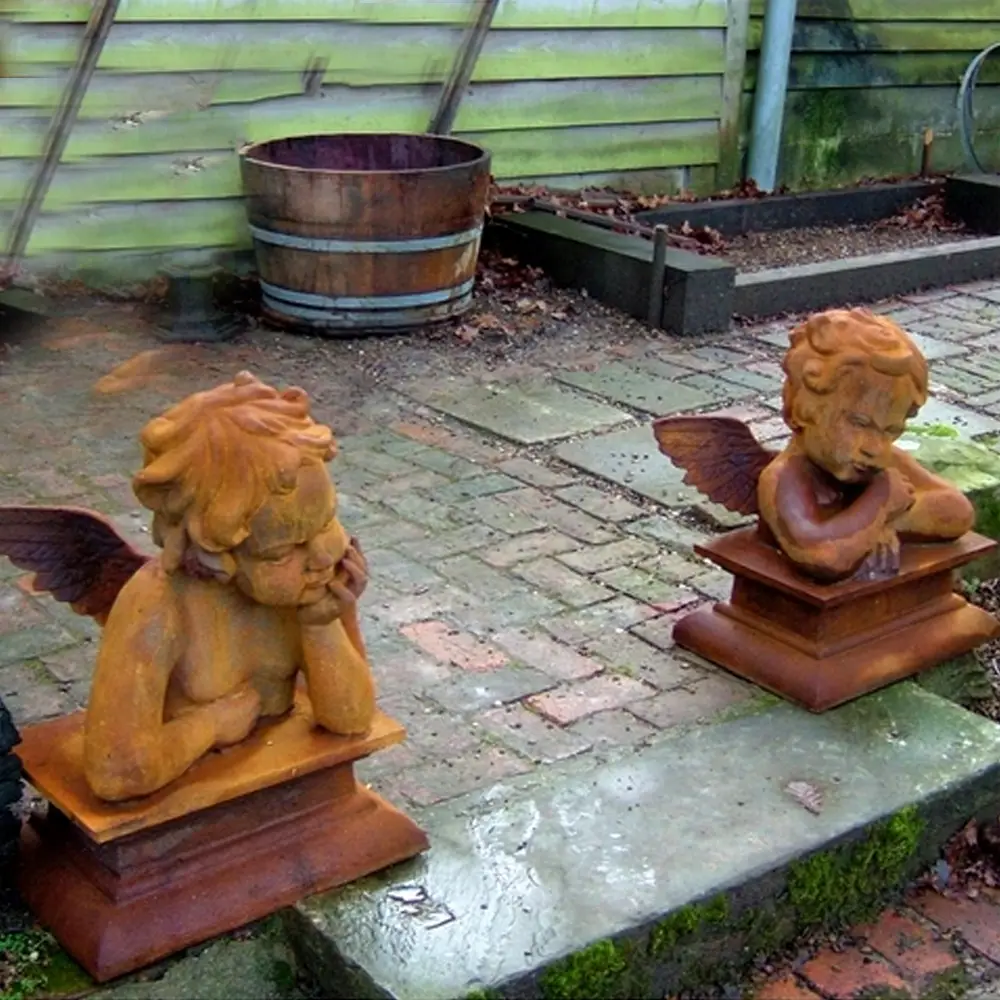As with all cast iron products, this statue will continue to gently develop its own unique patina. Depending on positioning and environment, this can include mossing and general weathering. In order to begin this process, we store these statues outside. As rust forms its own seal, decades of service are ensured. Whilst a weathered look is generally preferred, a uniform finish can be achieved by priming and spraying or painting as required.