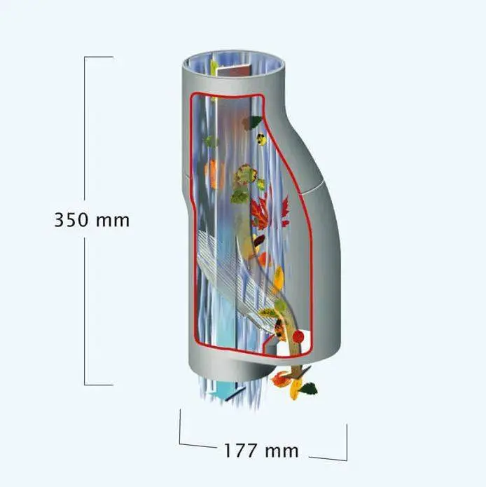 Acts as a pre-filter by draining leaves at the base of gutters. Prevents blockages by swallowing the water quality of containers, ponds and infiltration systems. Self-cleaning and maintenance-free.